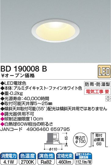 | 商品名 | LEDダウンライト(SB形) BD190008B |