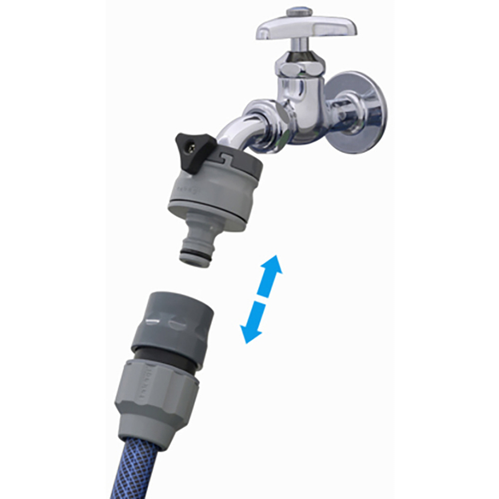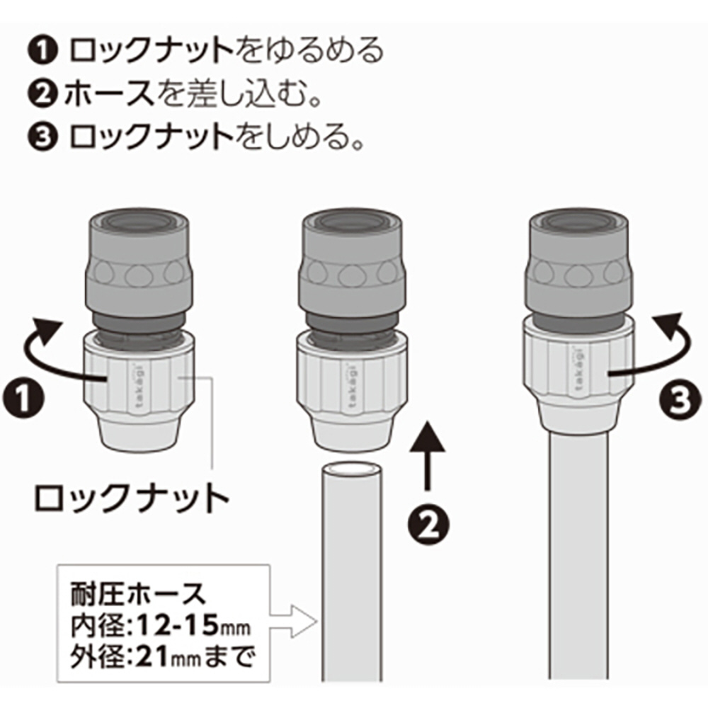 ■ナットを緩めてホースを差し込むだけ、コネクターにワンタッチでホースをつなぎます。