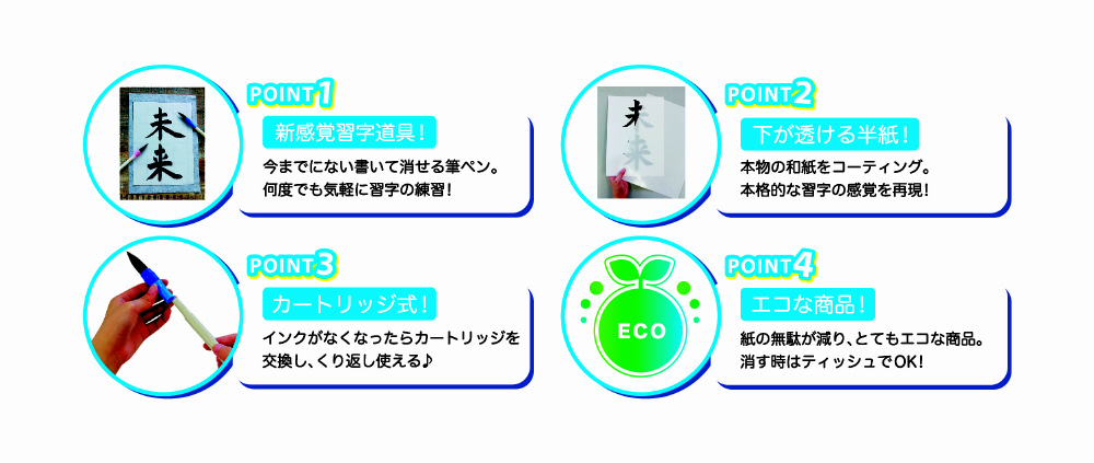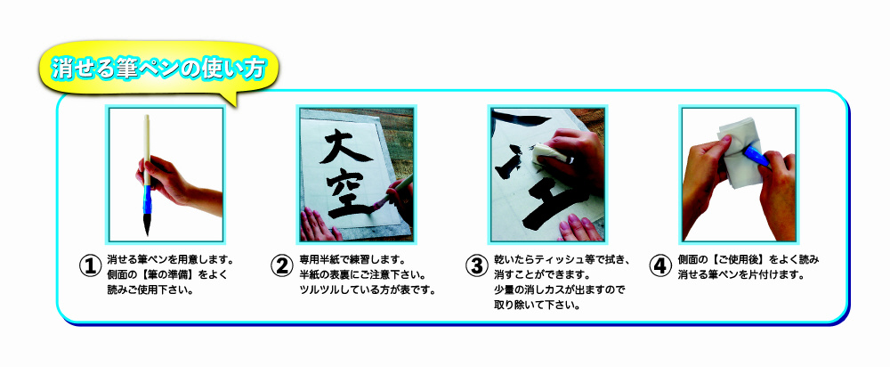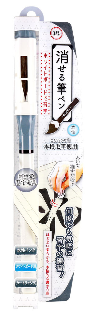 ホワイトボードやオリジナル専用半紙に書いて、ティッシュペーパーで消すことができる筆ペンです。面倒な習字道具の用意も必要なく、手軽に練習できます。穂先には獣毛を使用し、本格的な書き心地を再現しています。