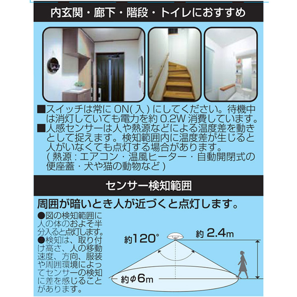 ● 周囲が暗いとき人が近付くと自動点灯、離れると120秒後自動消灯