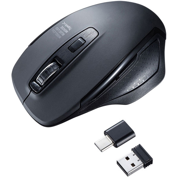 USB TYPE-C・A レシーバーを2個搭載した5ボタンイヤレスブルーLEDマウス。