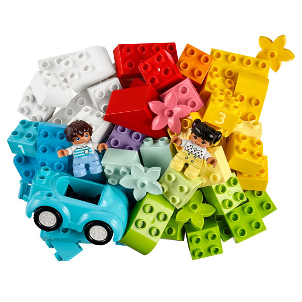 このコンテナには、カラフルなデュプロのブロックがいっぱい。お人形や車、屋根、窓、花、パンなどのパーツも入っています。
