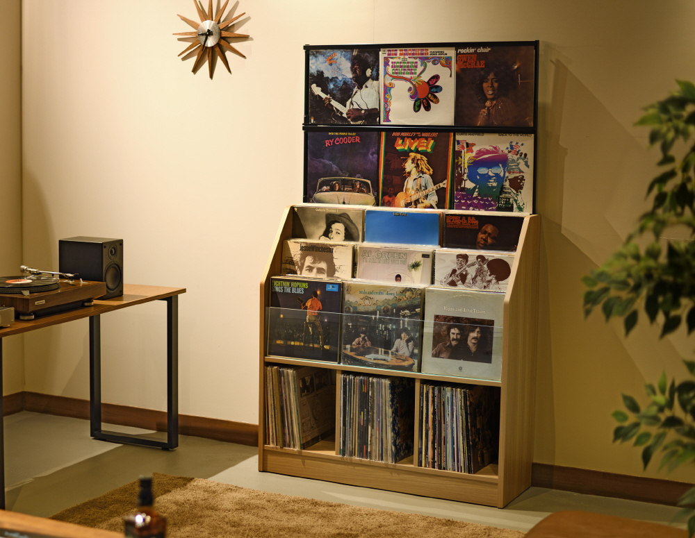 アナログレコードのコレクションをレコード店のようにディスプレイしながら収納できます。