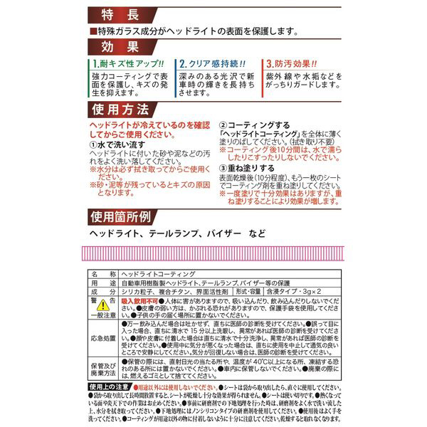 固いガラス皮膜を形成しヘッドライトの変色を防ぎ輝きを一年以上持続させます。