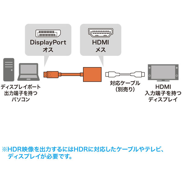 DisplayPortポートからHDMI入力のテレビやディスプレイに出力するための変換アダプタ。HDR対応。
