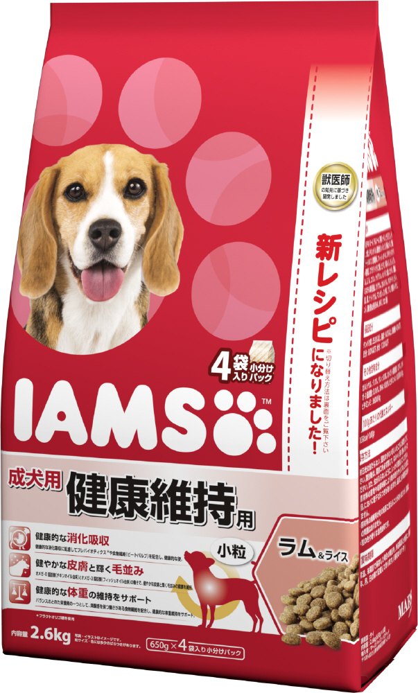| 商品名 | IAMS(アイムス)成犬用 健康維持用 ラム&ライス 小粒 2.6kg(650g×4袋) |