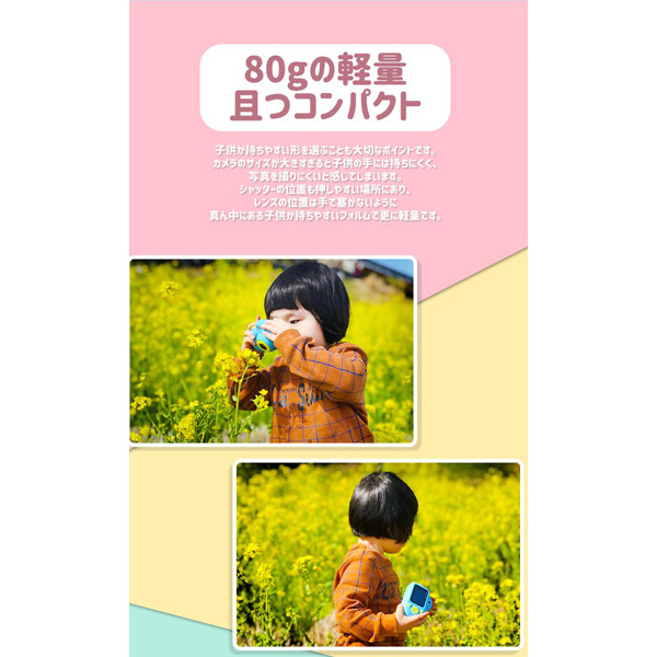 子供が持ちやすい形を選ぶことも大切なポイントです。カメラのサイズが大きすぎると子供の手には持ちにくく、写真を撮りにくいと感じてしまいます。シャッターの位置も押しやすい場所にあり、レンズの位置は手で塞がないように、真ん中にある子供が持ちやすいフォルムで更に軽量です。