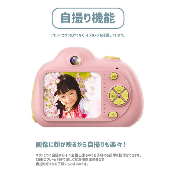 フロントカメラだけでなく、インカメラも搭載しており、画面に顔が映るので自撮りもラクラクできます。ボタン一つで自撮りモードへ変更でき、お子様でも簡単に操作ができます。30個のフレーム付きで楽しく写真撮影できるので、自撮り好きなお子様にもおすすめです。また、タイマー撮影・ライト機能もついているので、よりベストな写真をとることができます。
