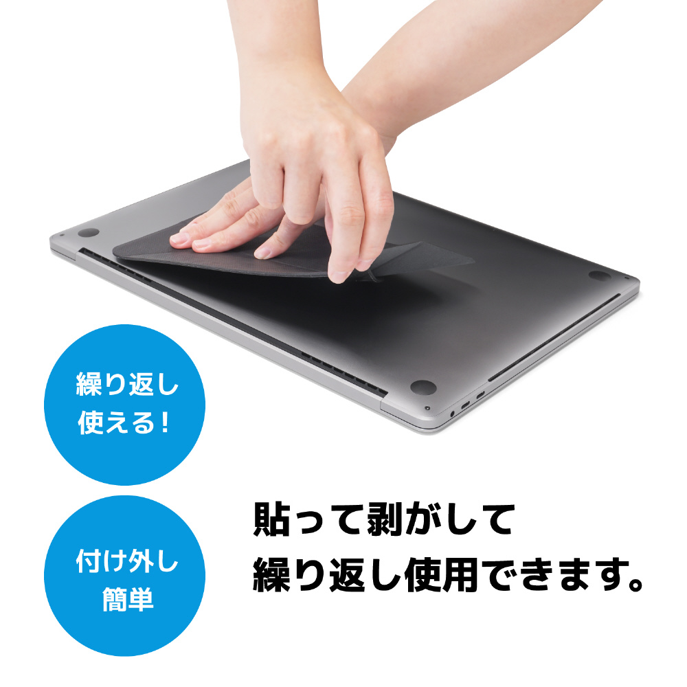 画面を持ち上げて見やすく、キーボードも打ちやすい角度に。貼って剥がして繰り返し使用できます。