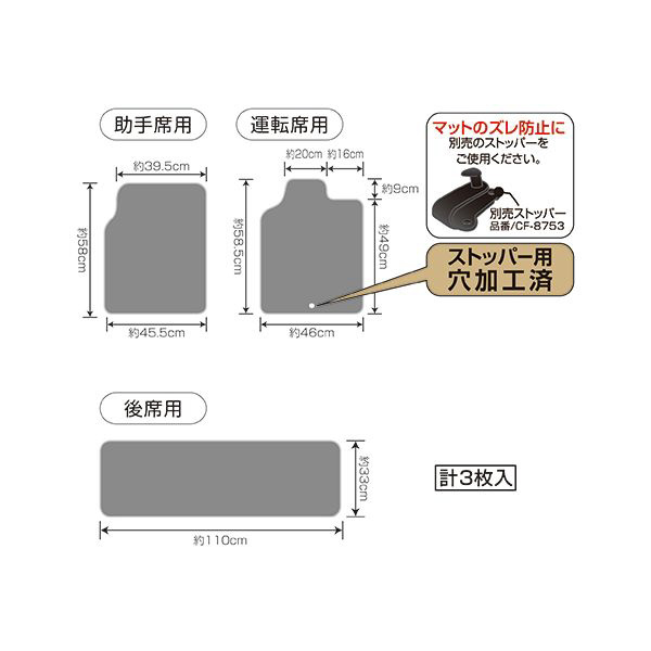■品質:表面…ポリエステル、裏面…合成ゴム(TPR)【フロアマット使用時の注意】※ 事故防止の為、下記状態では絶対に使用しないよう、ご注意をお願い致します。◆マットが前方にズレて、ペダル類の下に潜り込んだ状態◆ペダル類の上にマットを被せた状態◆シワになったり、一部が捲れた状態安全の為、ズレ防止ストッパー(別売り)を併用してご使用頂く事をおすすめ致します。