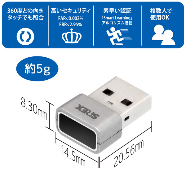 添付のUSB拡張ケーブルを使用することで自由に設置することができ、デスクトップPCでも不自由なく使用可能。指紋でWindowsログオン・スクリーンロック解除が可能。指紋認証ソフトウェア(OmniPassSE)標準添付。指紋とパスワードによる二要素認証に対応。Windows Hello対応。指紋によるファイル暗号化・復号化に対応。複数ユーザの指紋登録に対応(1ユーザーアカウントあたり10本分まで登録可能)。