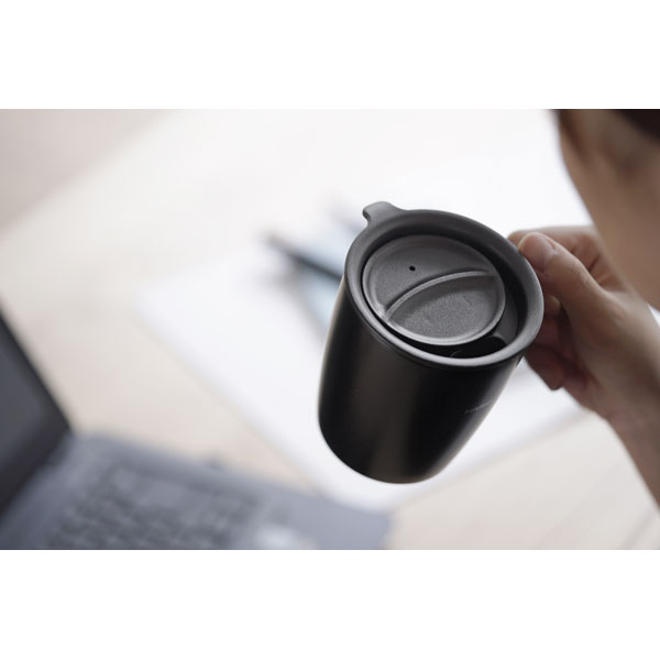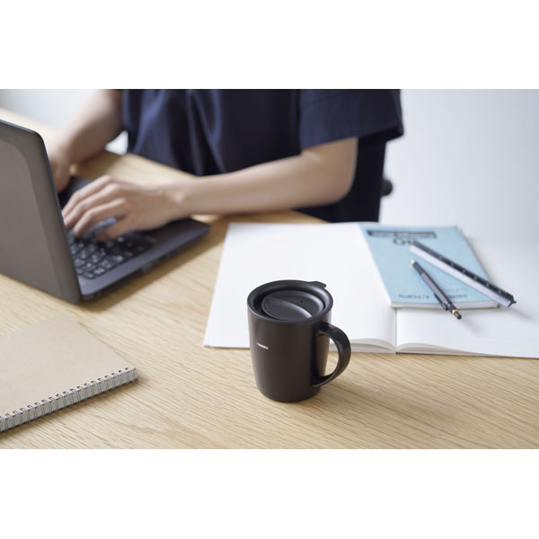 オフィスや自宅での使用に便利なフタ付き保温マグ。