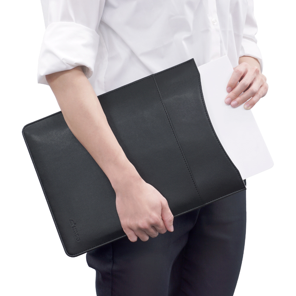 シボ入りで質感の良いPUレザーは高級感のある落ち着いた雰囲気。内側は柔らかな起毛素材でパソコンを優しく保護します。