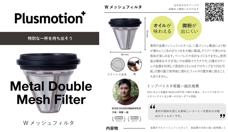 専用の金属メッシュフィルターは、二重メッシュ構造により粉が漏れにくく舌のざらつきを大幅に軽減。