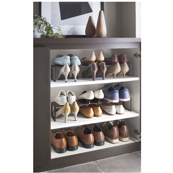 下駄箱の中の収納力を倍にする伸縮シューズラック。伸縮できるから下駄箱のサイズに合わせて調整も自由自在