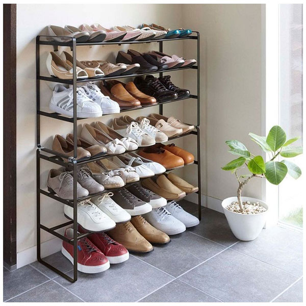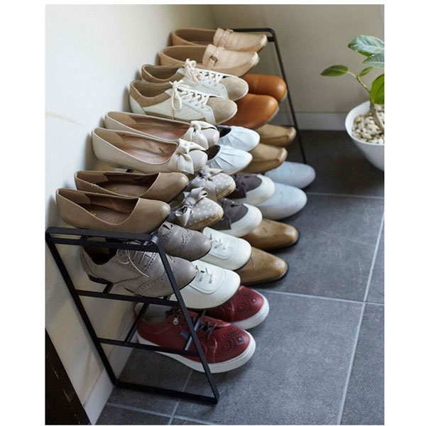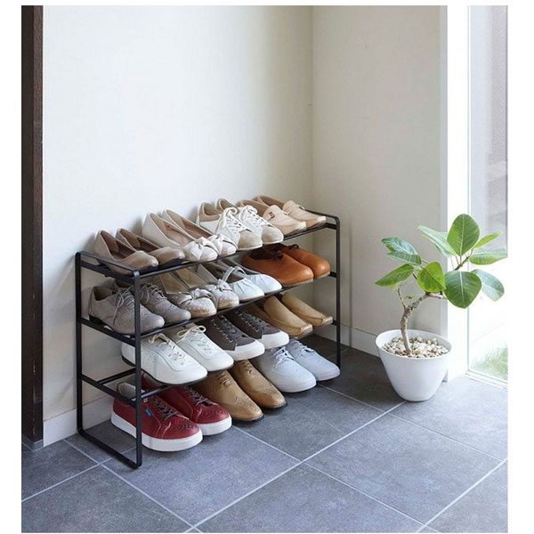 伸縮自在の3段シューズラック。玄関スペースや靴の量に合わせて横幅を調整可能。男性のシューズなら最大約12足、女性のヒールなら最大約16足収納可能
