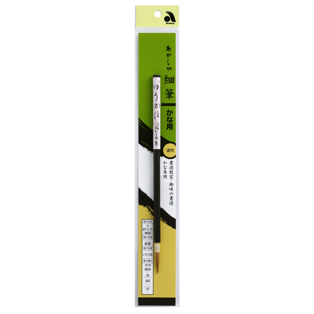 この筆は中国北方のイタチ毛を使い、なめらかさ、ねばり、弾力等を工夫していますので仮名専用としてお使いください。仮名文字に必要な鋭く強い線、暖かく柔らかな線が合わせて表現できます。