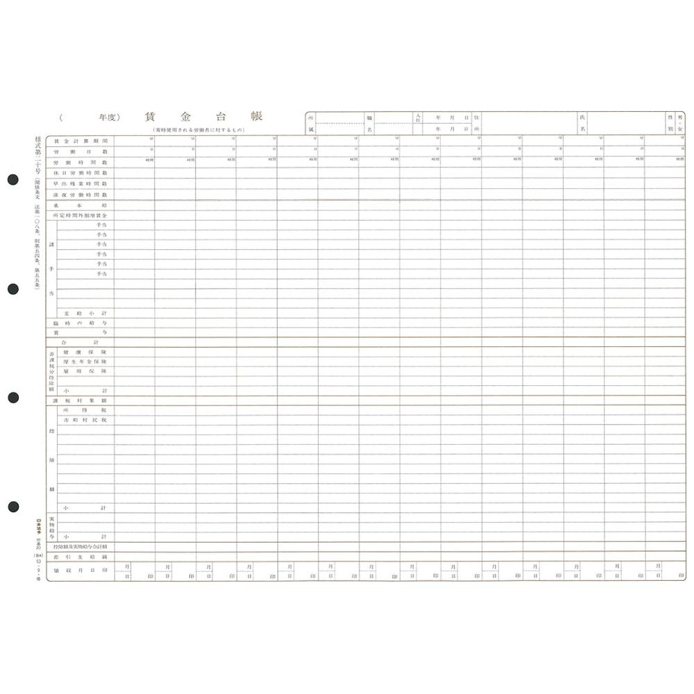 本商品は、常時労働者(日々雇い入れられる者でも1カ月を超えて引き続き使用される労働者を含む)を使用する事業場において調整し、備え付けて置かねばならない様式(賃金台帳)です。B4判で1年分用。
