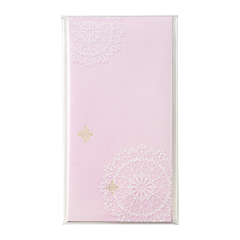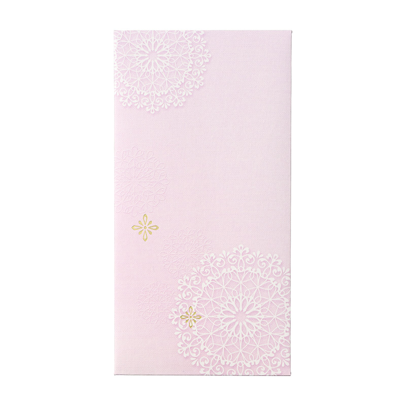 お礼、心づけ、挨挨拶などに使用できる無地の万円袋(封筒タイプ)です。レースのモチーフにさりげない箔押しが上品なデザインで、優しい色合いに生地風の地模様が優しい雰囲気を演出しています。字なしタイプはあらゆる用途に使用できます。サイズ:90×175mm。5枚入。
