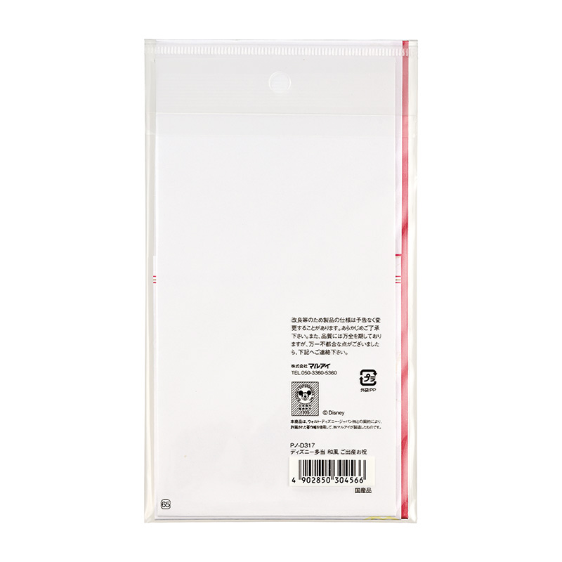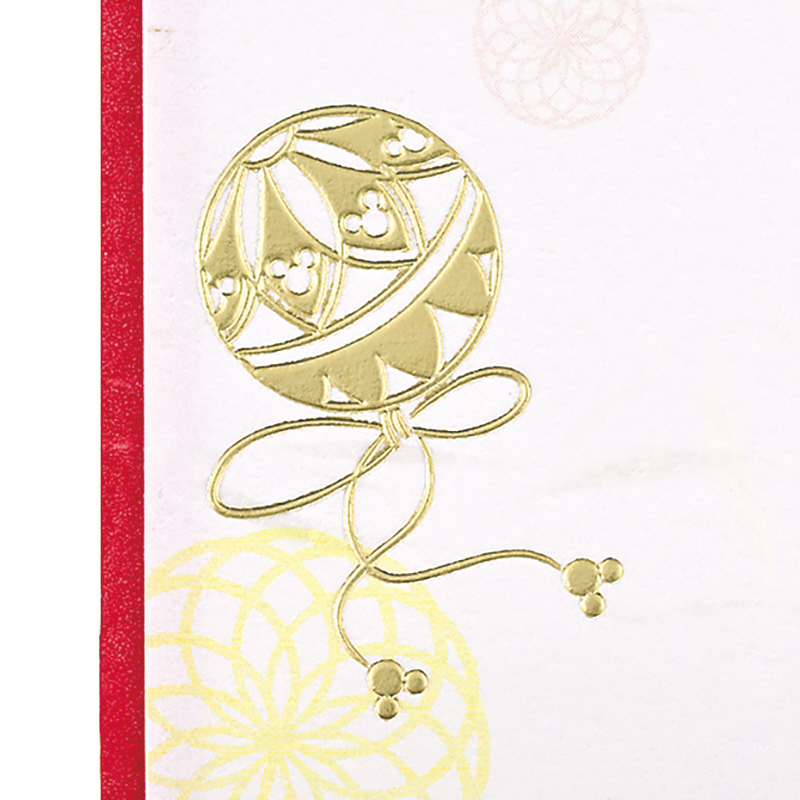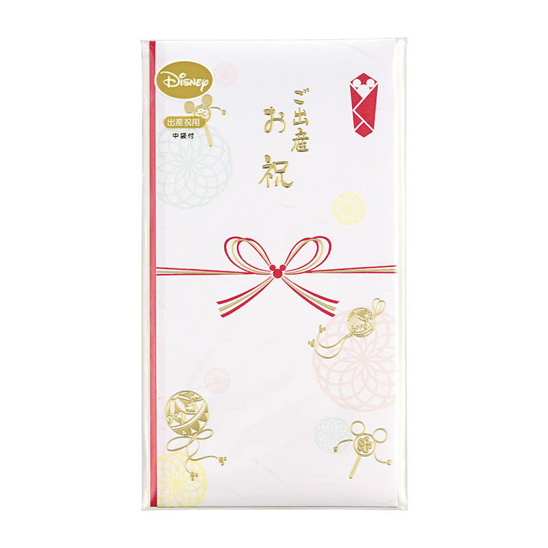 日本の伝統文様とミッキーマウスが出合う、ベーシックな祝儀袋のデザインにキャラクターがもつ楽しくハッピーな雰囲気を織りまぜた、新しい「和」のカタチです。風合いのある大礼模様入りの紙を使用しています。「ご出産お祝」の文字がエンボス+金箔押し加工されています。サイズ:95×180mm。中袋付。1枚入。