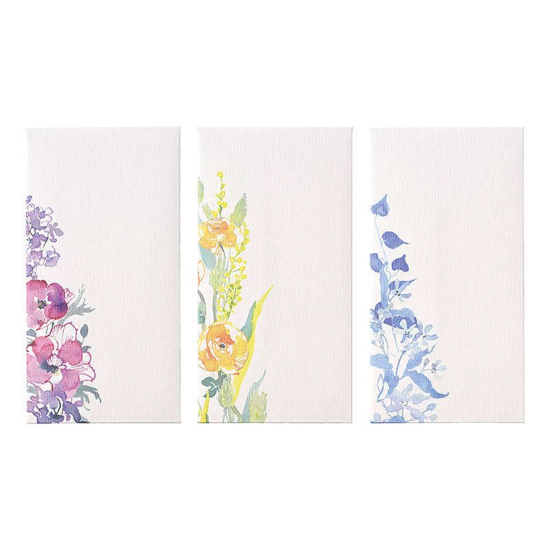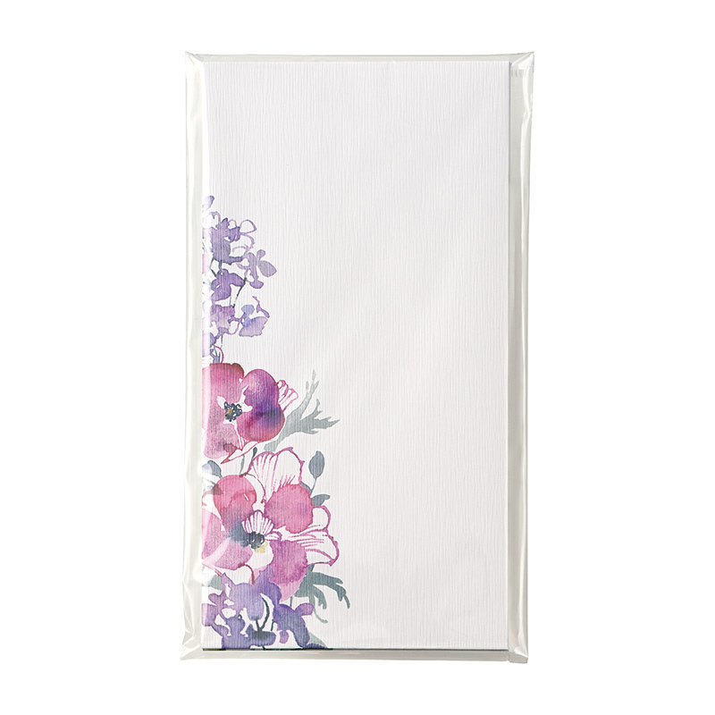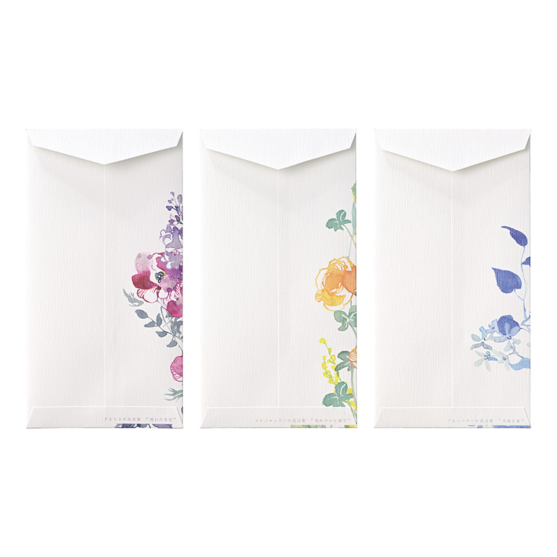 美しい水彩のタッチで花束を描いた華やかな封筒です。表情豊かな3つの花柄をアソートしています。本体裏側に柄に合わせた花言葉を書き添えています。花言葉は、アネモネ“明日の希望”、ラナンキュラス“晴れやかな魅力、”ブルースター“幸福な愛”。サイズ: 90×172mm。6枚(3柄×各2枚)入。