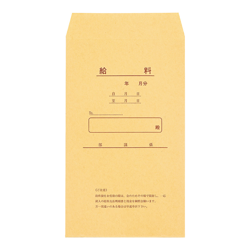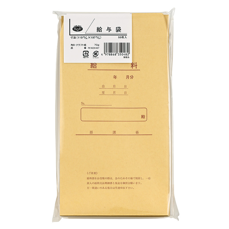 毎月の給与を渡す際の給与袋です。サイズ: 119×197mm(角形8号)。50枚入。古紙40%使用。グリーン購入法適合。エコ商品ねっと掲載。