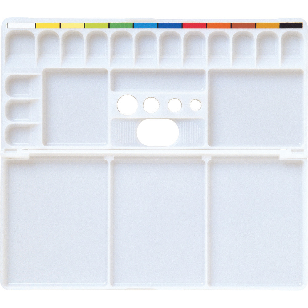 間仕切りが高めで、色が混ざりにくい設計。「キャップはずし」付き。えのぐをはじきにくい処理をしています。使いやすい色表示付き。