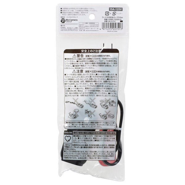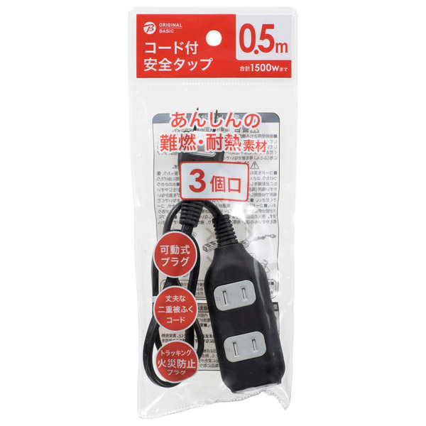 | 商品名 | コード付き安全タップ 黒 HSBK-TS305-K [0.5m /3個口 /スイッチ無] |