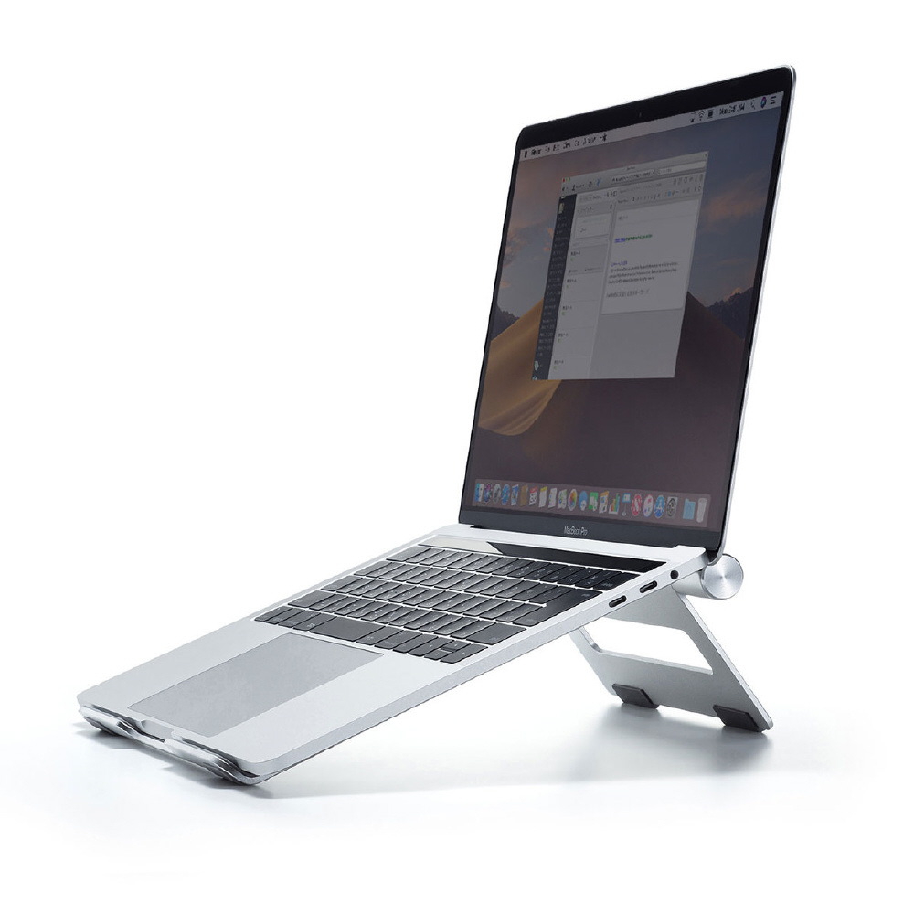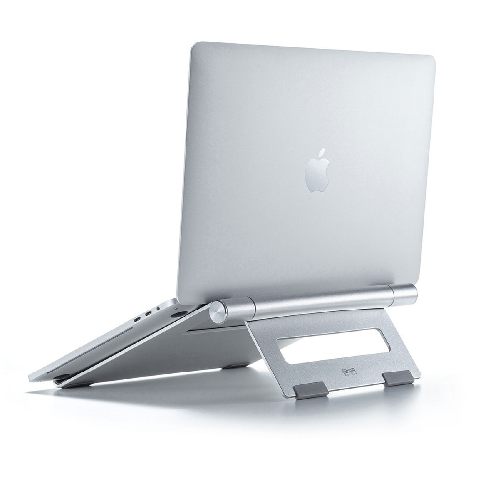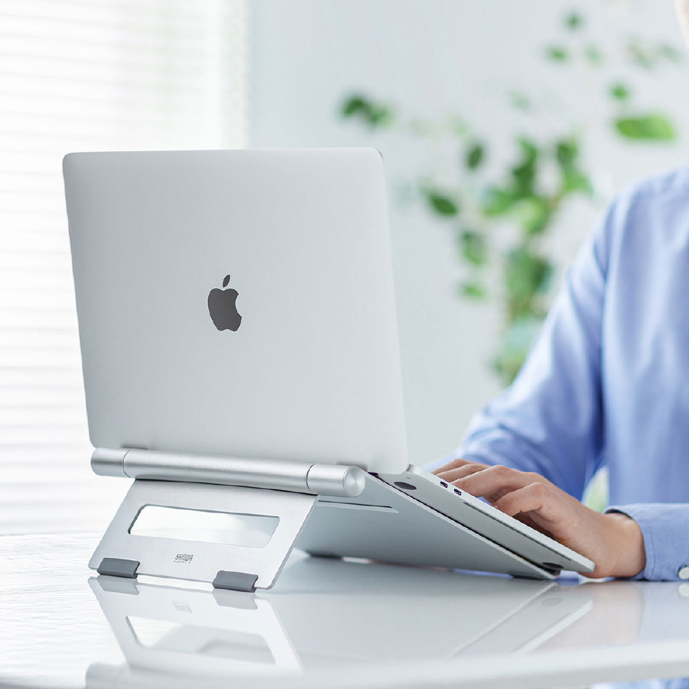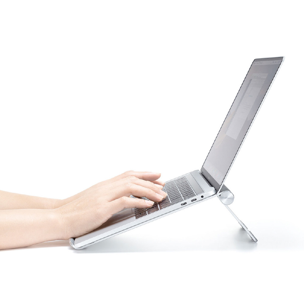 ノートパソコン使用時の視線を上げて姿勢を正し、長時間使用での体への負担を軽減するアルミ製ノートパソコンスタンド。