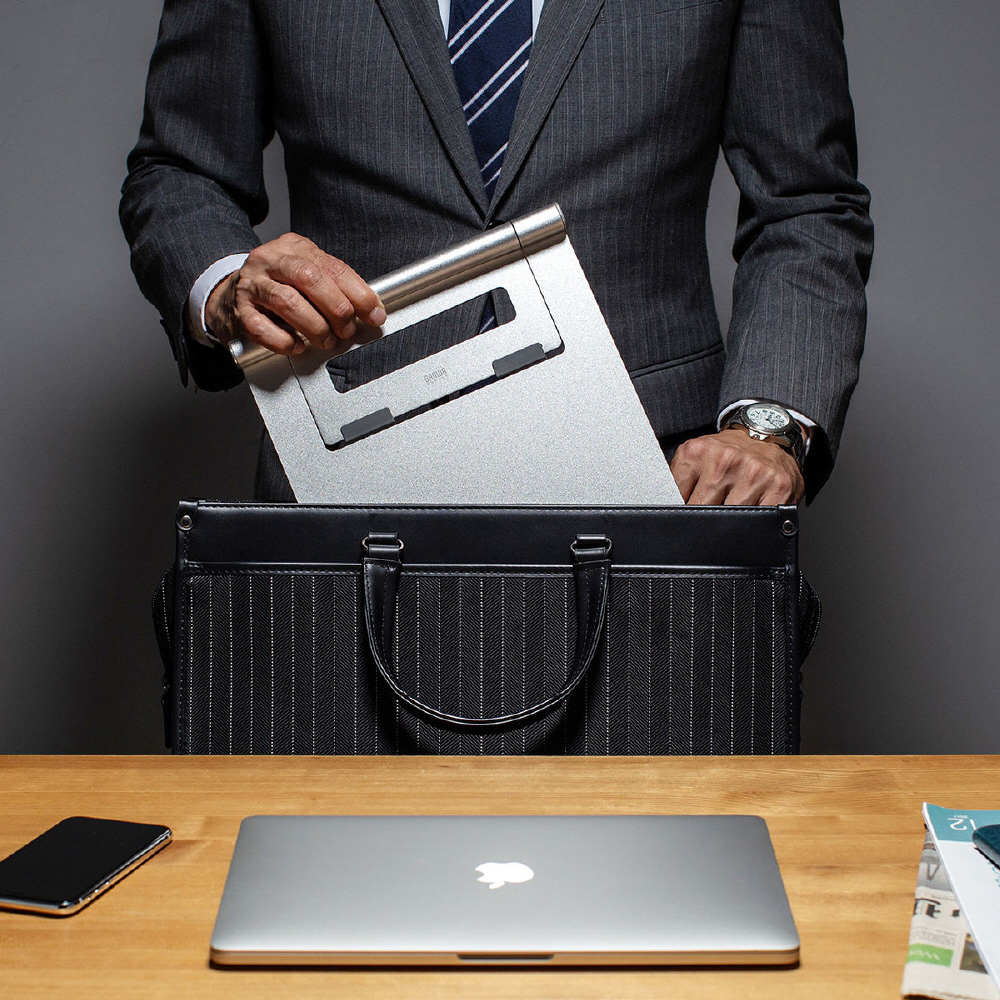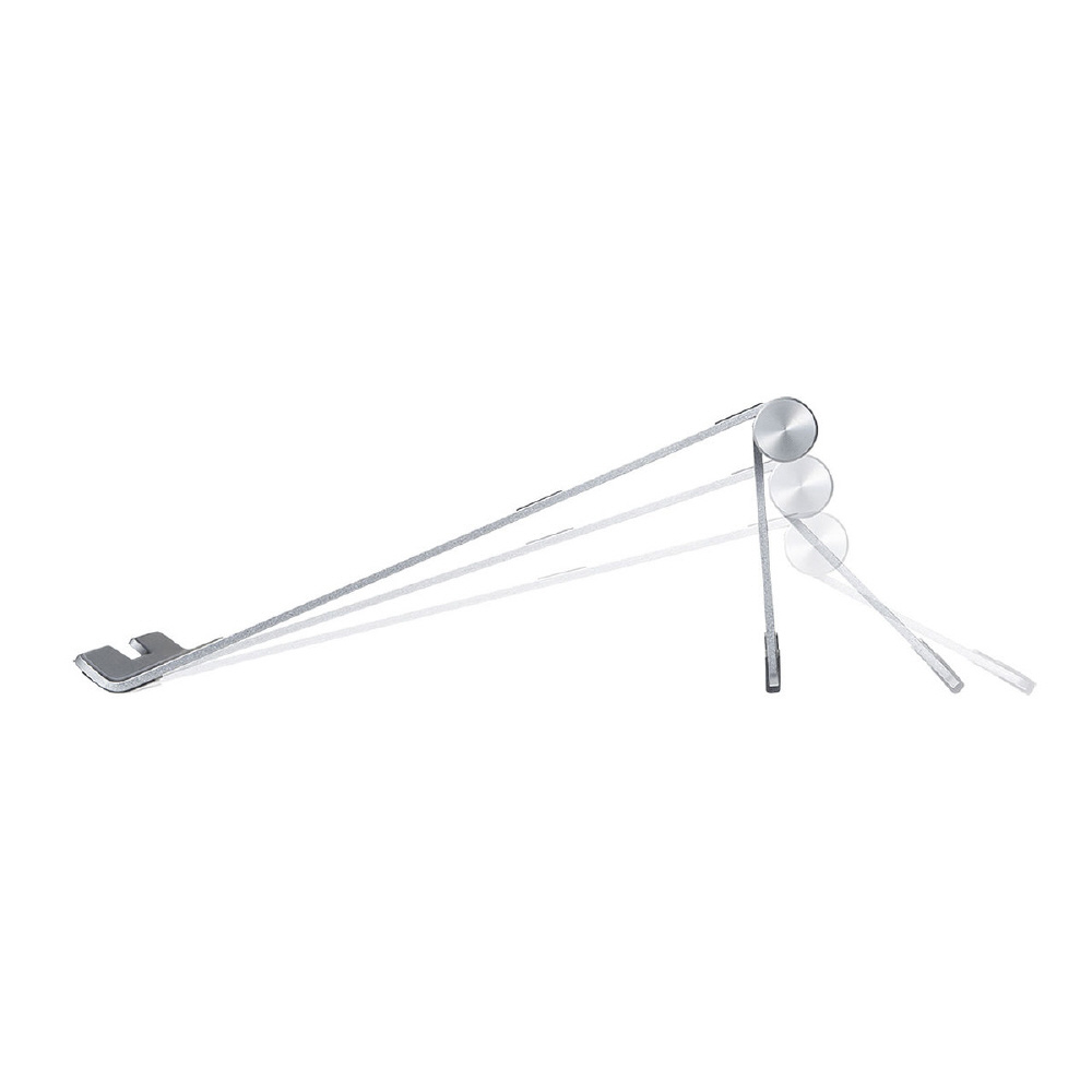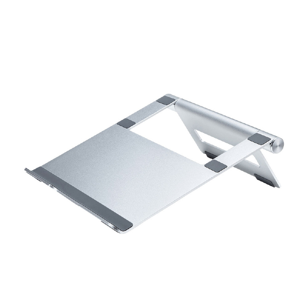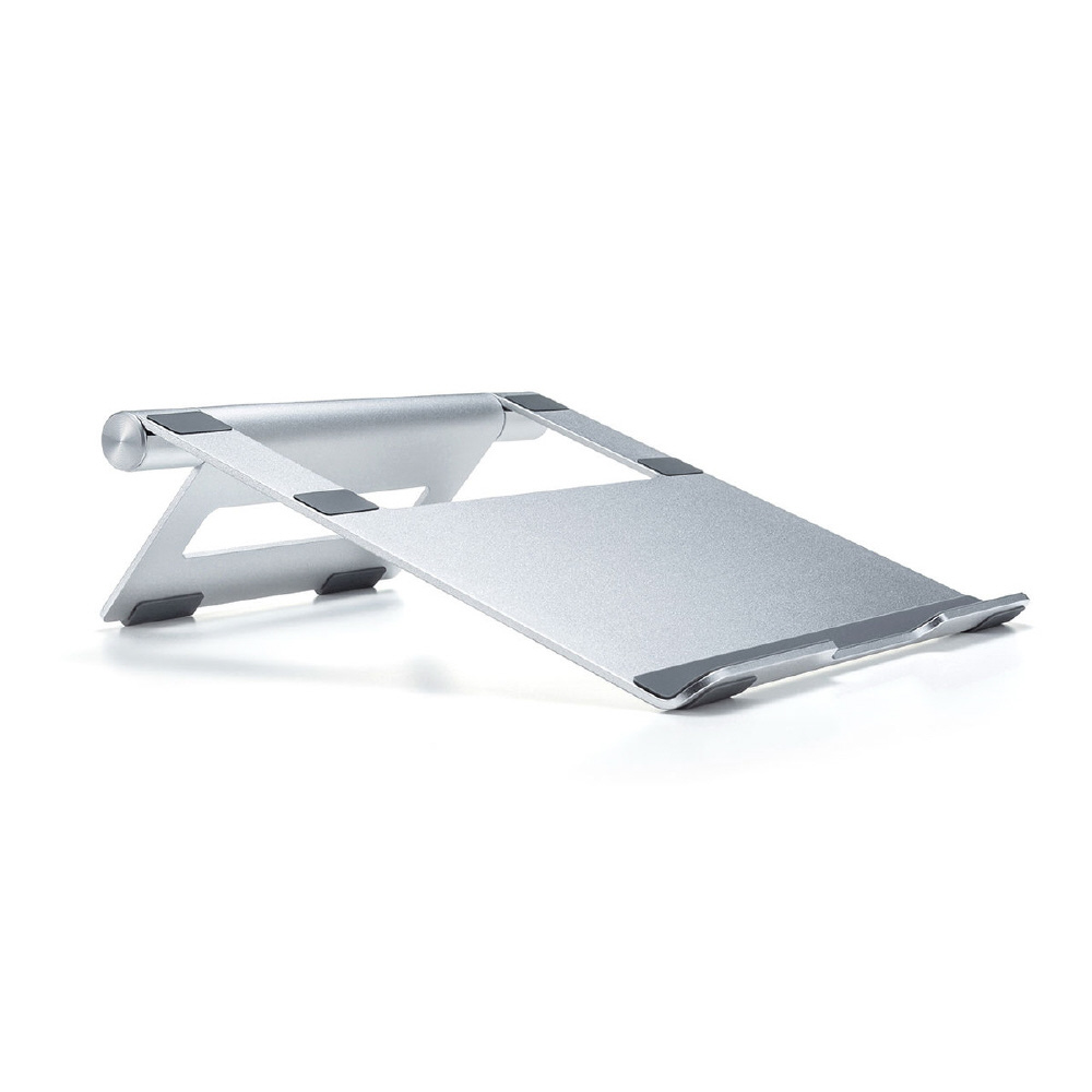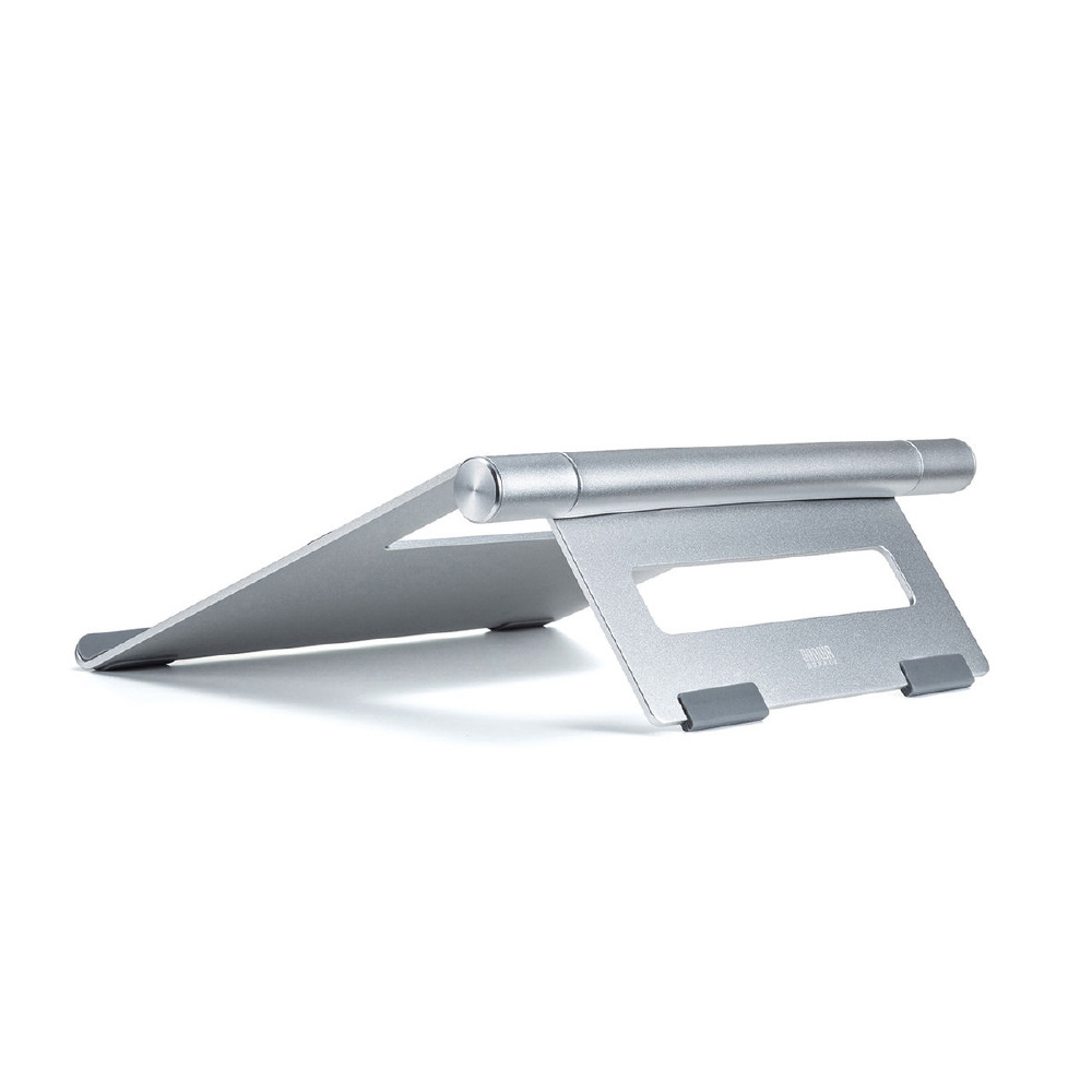 ノートパソコン使用時の視線を上げて姿勢を正し、長時間使用での体への負担を軽減するアルミ製ノートパソコンスタンド。