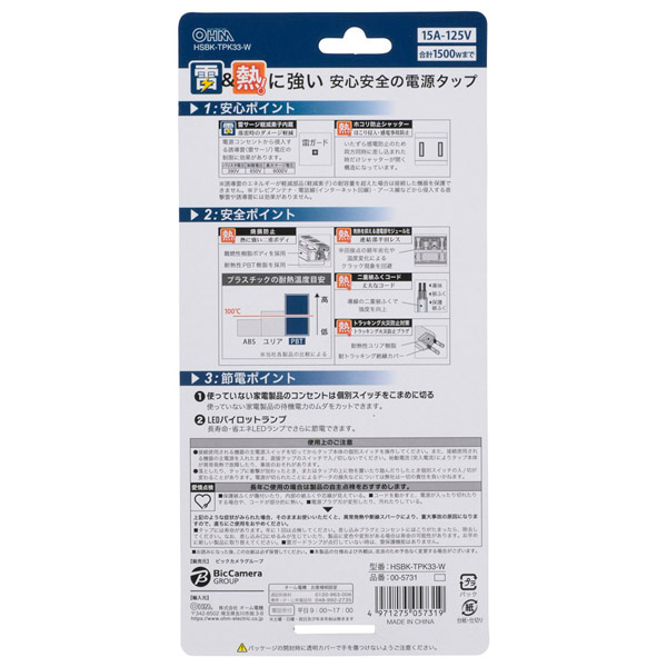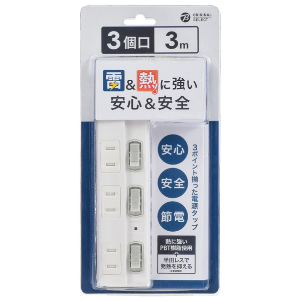 | 商品名 | 節電タップ 白 HSBK-TPK33-W [3.0m /3個口 /スイッチ付き(個別)] |