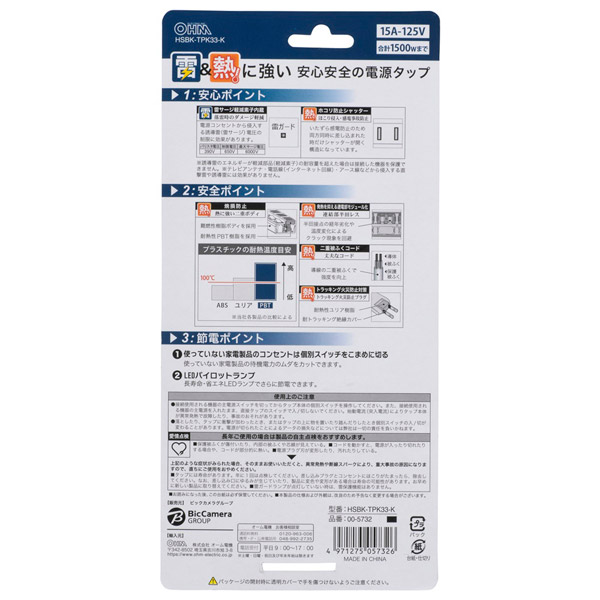 | 商品名 | 節電タップ 黒 HSBK-TPK33-K [3.0m /3個口 /スイッチ付き(個別)] 【864】 |