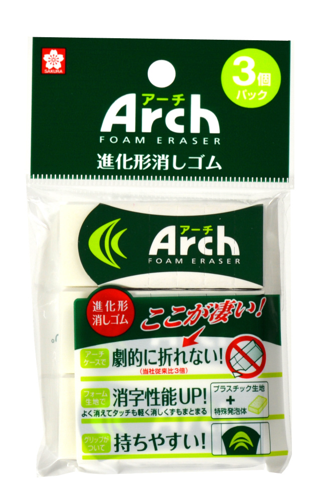 【アーチフォームイレーザーの特長】●新形状:アーチケースで劇的に折れない! ケース前部をアーチ形状にすることで、食い込み部分への負荷を大幅に軽減。●新配合:フォーム生地で消字性能アップ! プラスチック生地+特殊発泡体=フォーム生地●新触感:グリップがついてもちやすい。すべりにくく、軽い力で消せる【入数】3個入り【サイズ】59×23×10mm/個