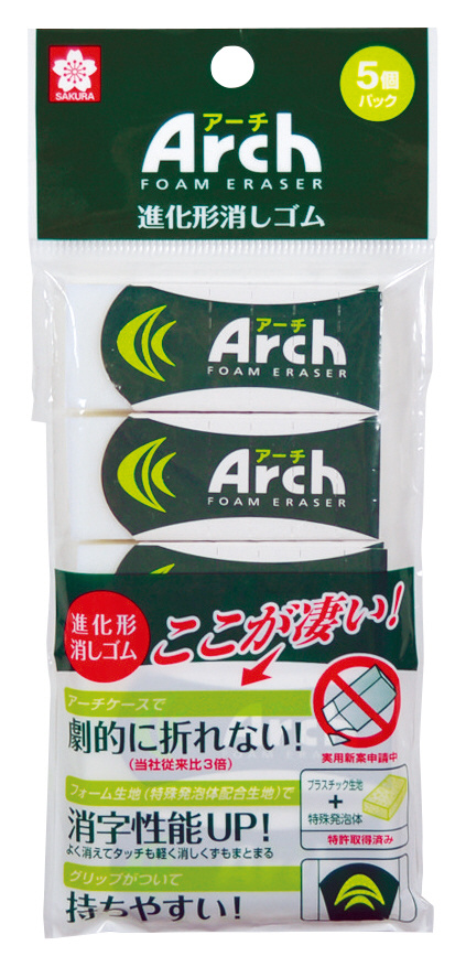 【アーチフォームイレーザーの特長】●新形状:アーチケースで劇的に折れない! ケース前部をアーチ形状にすることで、食い込み部分への負荷を大幅に軽減。●新配合:フォーム生地で消字性能アップ! プラスチック生地+特殊発泡体=フォーム生地●新触感:グリップがついてもちやすい。すべりにくく、軽い力で消せる【入数】1個入り【サイズ】59×23×11mm/個