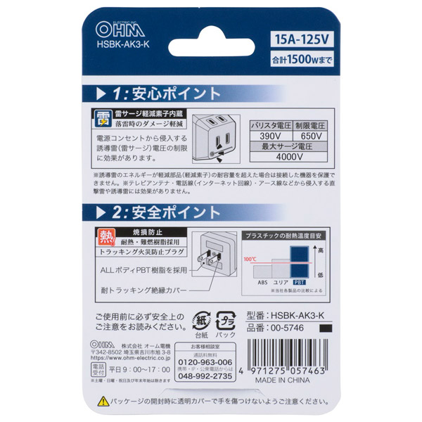 | 商品名 | 雷ガード 電源タップ 黒 HSBK-AK3-K [直挿し /3個口 /スイッチ無] 【864】 |
