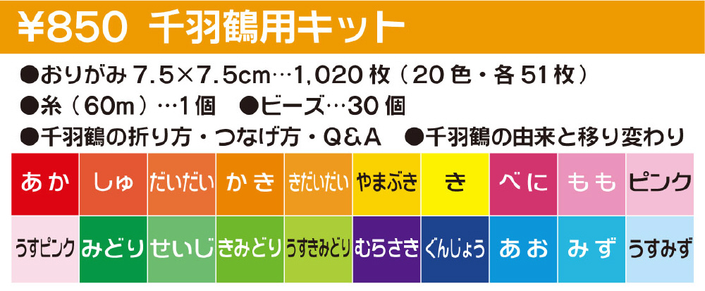 | 仕様1 | セット内容:●7.5×7.5cm 1020枚(20色×各51枚) ●糸 60m(綿系) ●ビーズ 30個(白) ●千羽鶴の折り方・つなぎ方 ●千羽鶴Q&A ●千羽鶴由来と移り変わり |