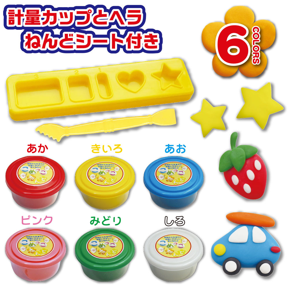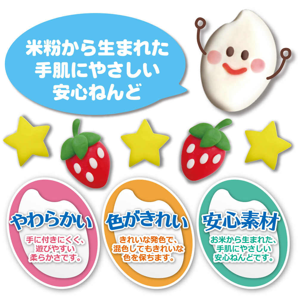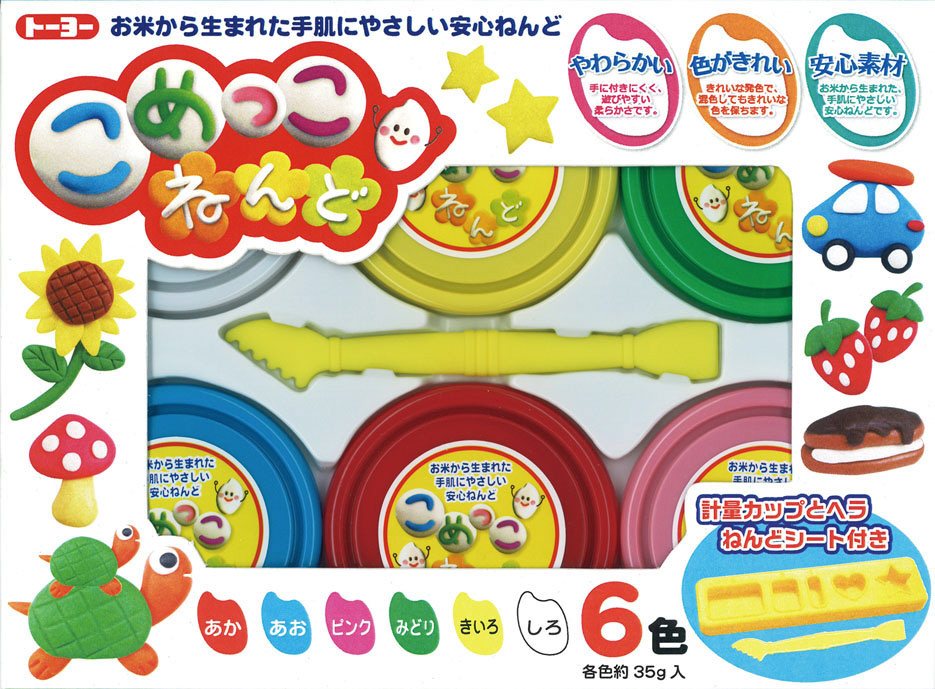 こめっこねんど6個(6色各35.0g入)計量カップ1個 ねんどヘラ1個 ねんどシート1枚主成分に米粉を使用しており、アレルギーを誘発しやすい7大アレルゲン(卵・牛乳・小麦・落花生・えび・かに)をふくんでいません。色鮮やかで手肌に優しい安心のねんどです。