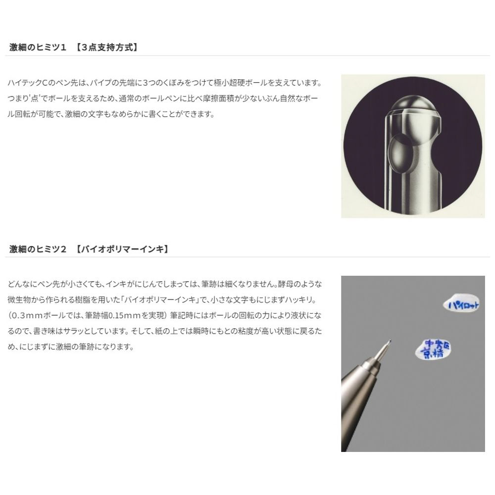 ハイテックCのペン先は、パイプの先端に3つのくぼみをつけて極小超硬ボールを支えています。つまり点でボールを支えるため、通常のボールペンに比べ摩擦面積が少ないぶん自然なボール回転が可能で、激細の文字もなめらかに書くことができます。