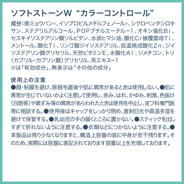 | 成分 | [有効成分] 焼ミョウバン、イソプロピルメチルフェノール [その他の成分]シクロペンタシロキサン、ステアリルアルコ-ル、POPブチルエ-テル-1、オキシ塩化Bi、セスキイソステアリン酸ソルビタン、水添ヒマシ油、酸化Cr被覆雲母Ti、メント-ル、酸化Ti、リンゴ酸ジイソステアリル |