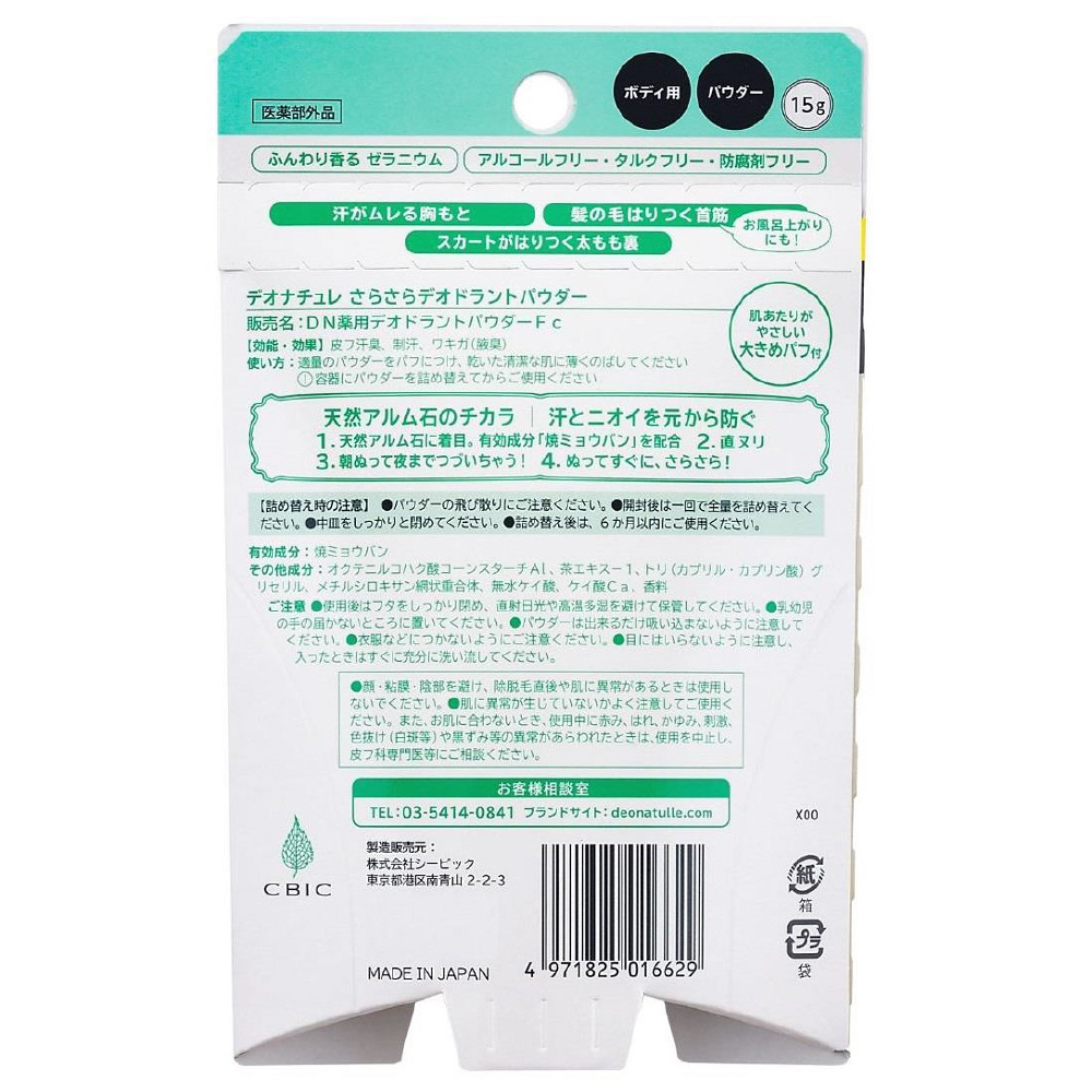 | 成分 | [有効成分] 焼ミョウバン [その他の成分]オクテニルコハク酸コーンスターチAl、茶エキス-1、トリ(カプリル・カプリン酸)グリセリル、メチルシロキサン網状重合体、無水ケイ酸、ケイ酸Ca、香料 |