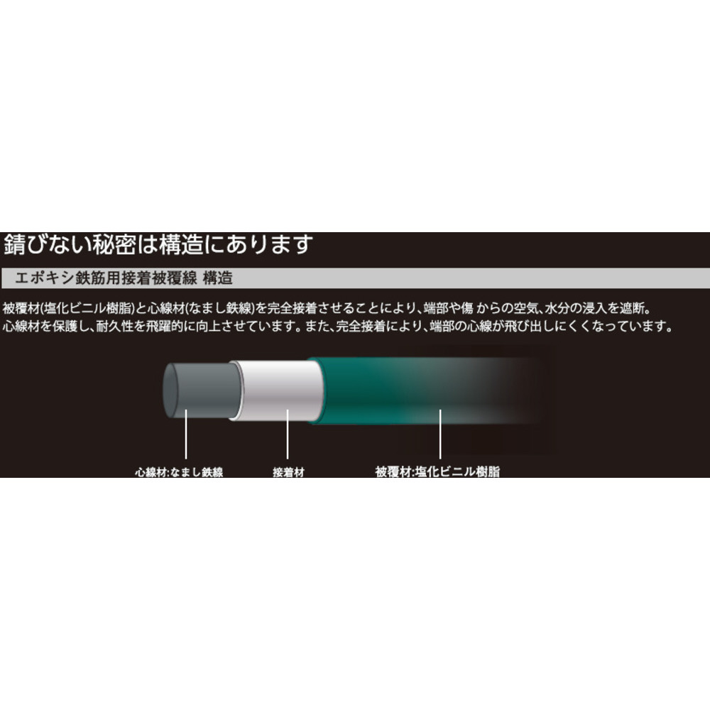 ■被覆材(塩化ビニル樹脂)と心線材(なまし鉄線)を完全接着させることにより、端部や傷からの空気、水分の浸入を遮断します。