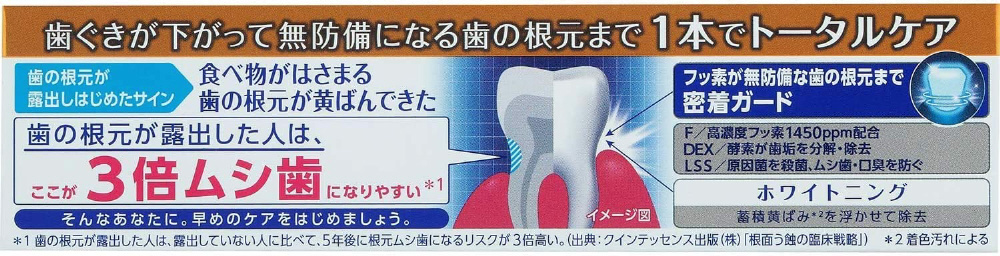 ◆高濃度フッ素(1450ppm)配合のジェルペーストが、無防備な歯の根元まで密着ガードし、根元ムシ歯まで予防します。