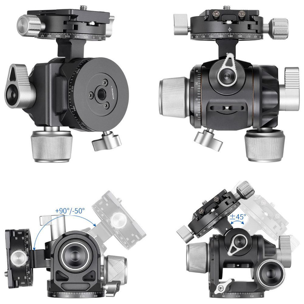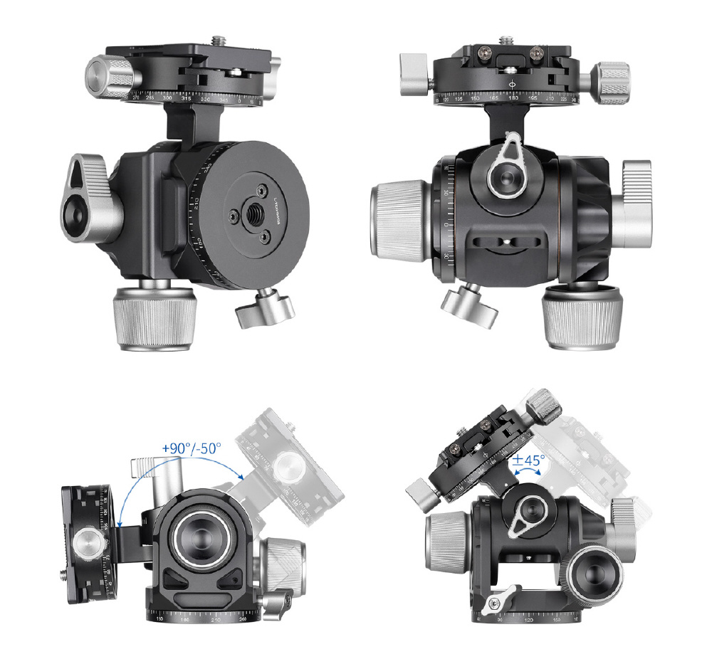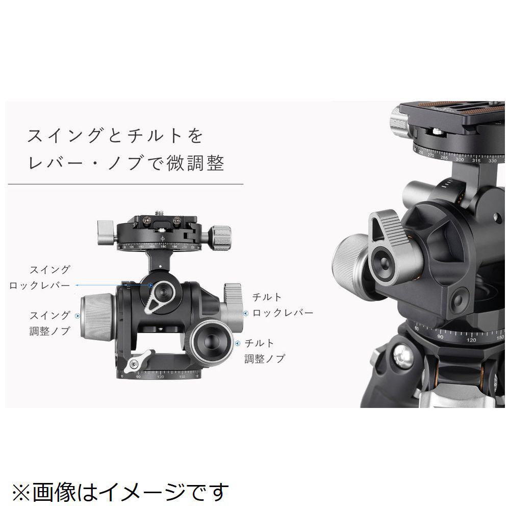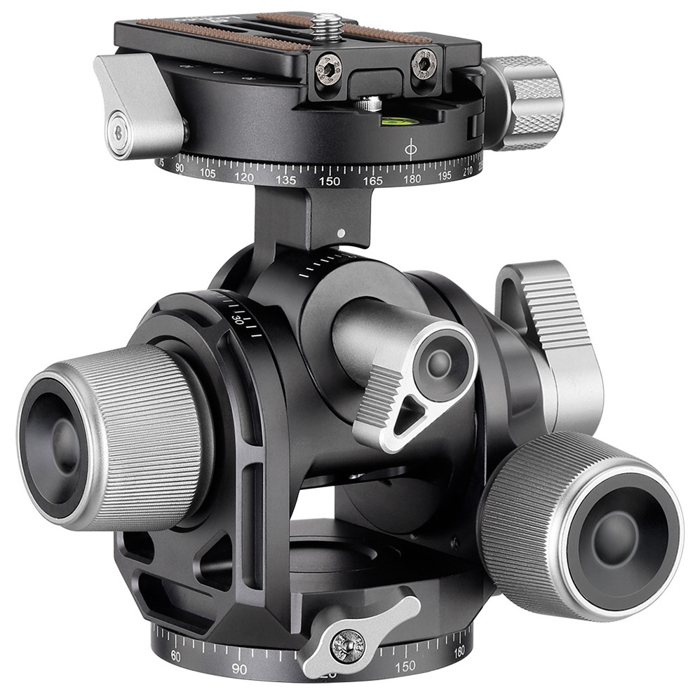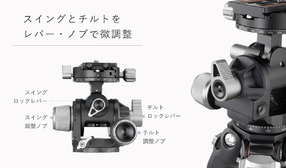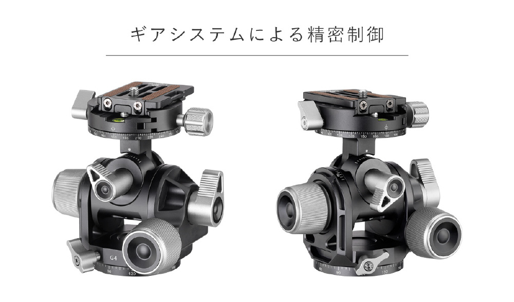 2箇所のダイヤルによる前後左右チルトの精密調整が可能なギア雲台。(※300mm以下のレンズでの使用を推奨。)