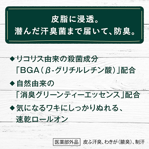 | 成分 | [有効成分]クロルヒドロキシアルミニウム液、緑茶乾留エキス、β-グリチルレチン酸 [その他の成分]エタノール、水、シクロジメチコン、濃グリセリン、無水エタノール、ヒドロキシプロピルセルロース、イソステアリルアルコール、香料 |