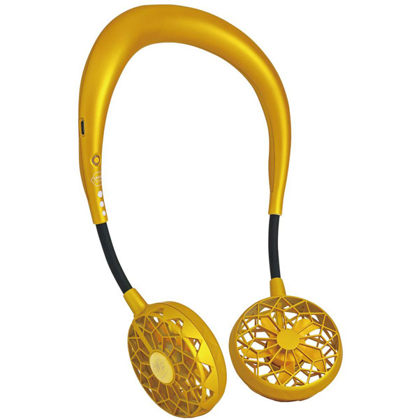 軽量な首掛けタイプなのでハンズフリーで快適。他人と差をつける特別なゴールドカラーを使用した高級感のある限定カラーモデル。USB充電で最大7時間の連続使用が可能。卓上に置いても使用できます。