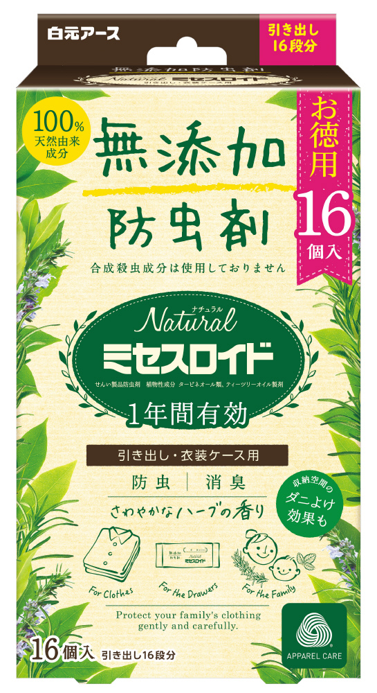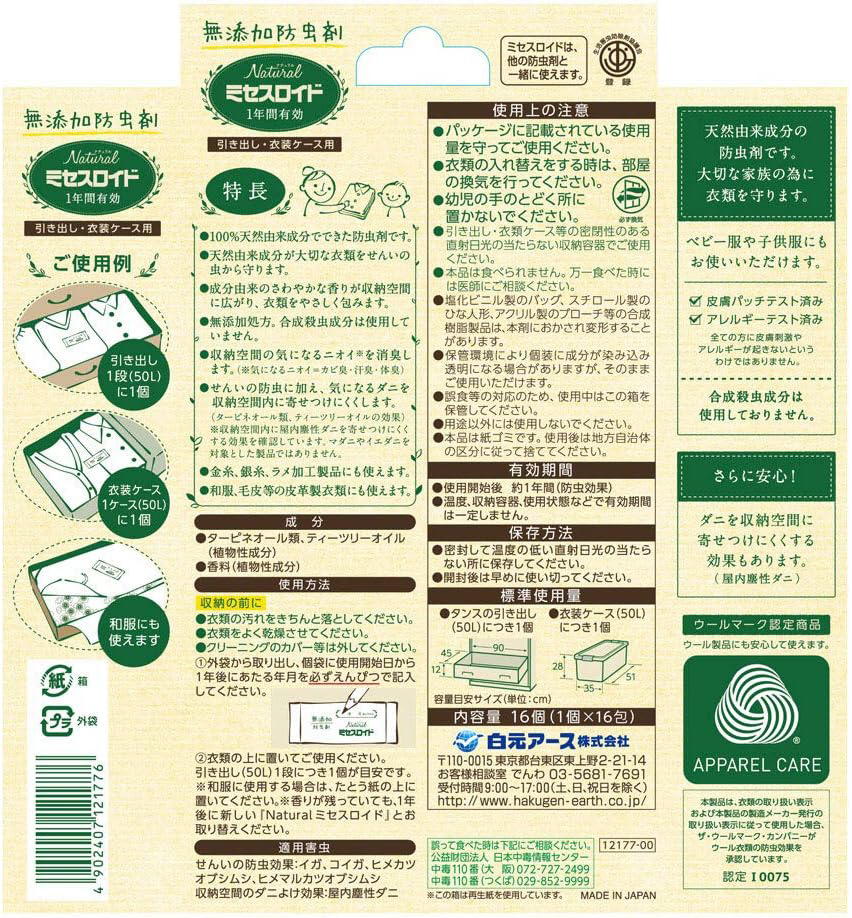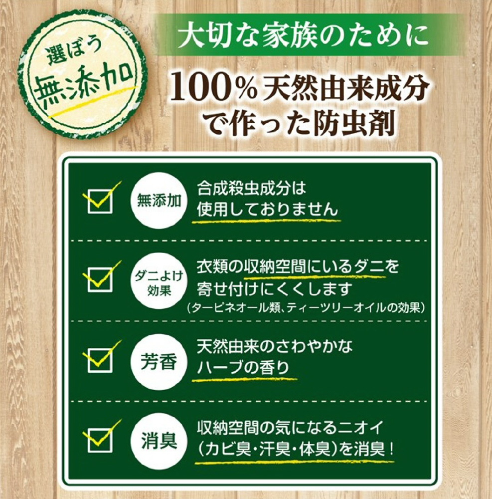 100%天然由来成分でできた防虫剤。無添加処方(合成殺虫成分は使用していません)。消臭機能・収納空間のダニよけ効果付き。引き出し16段分。1年間有効。