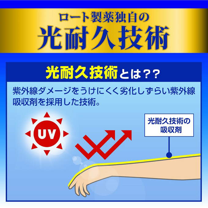 紫外線ダメージをうけにくく劣化しづらい紫外線吸収剤を採用した光耐久技術採用。