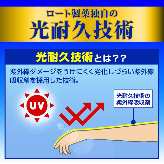 紫外線ダメージをうけにくく劣化しづらい紫外線吸収剤を採用した光耐久技術採用。