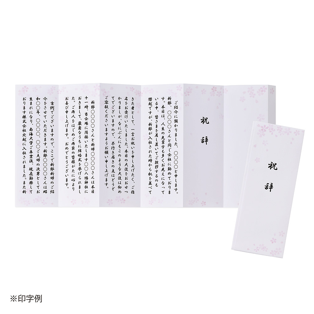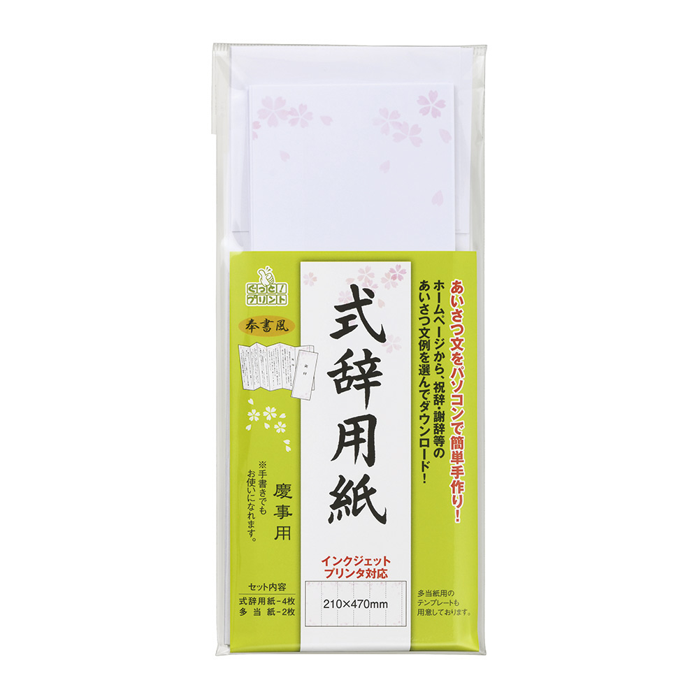 春のシーズンにピッタリのさくら柄のご家庭用のインクジェットのプリンタで印刷できる式辞用紙セットです。卒業式や入学式、結婚披露宴などのおめでたい場面に最適です。慶事用。手書きでもお使いになれます。祝辞、弔辞、謝辞などレイアウトも専用WEBサイトから文例テンプレートを無料でダウンロード。Microsoft Wordを使って自由に編集できます。式辞用紙、多当紙用のテンプレートを用意しました。セット内容:式辞用紙(210×470mm)4枚、多当2枚。※長尺タイプのため一部のプリンタでは出力できない場合があります。