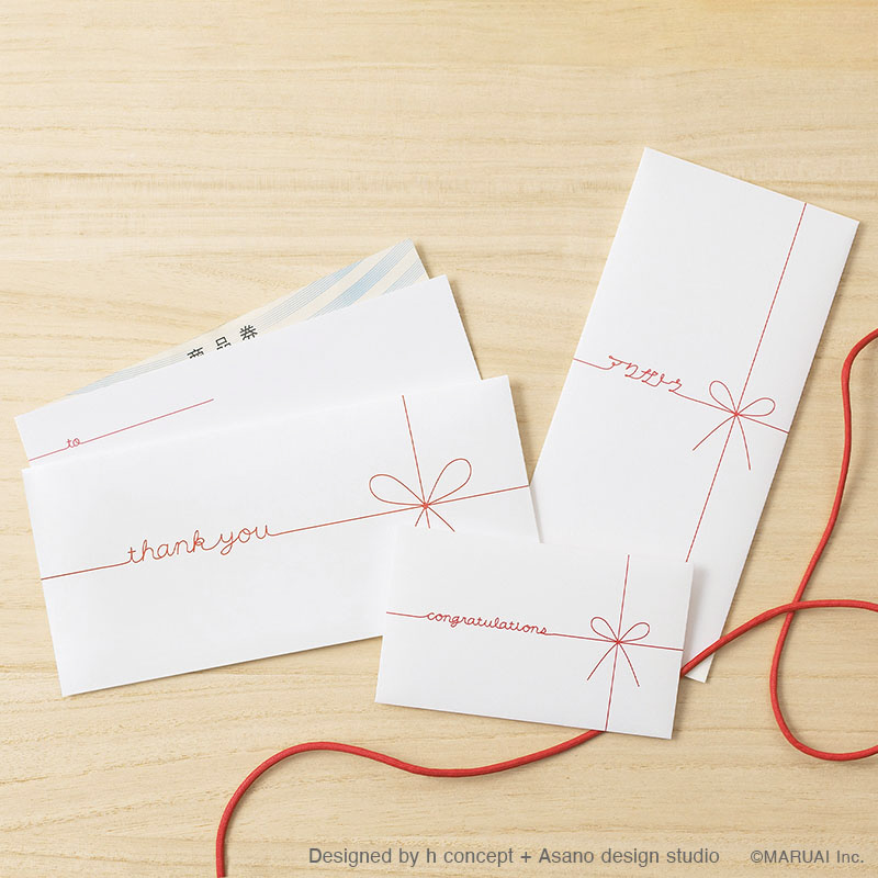 図書カードやプリペイドカードの贈答に、ぽち袋の代わりとして使用できる封筒タイプのギフト券袋(ミニサイズ)です。印刷された水引飾りには「congratulations」の文字が一緒にデザインされています。サイズ:110×65mm。5枚入。